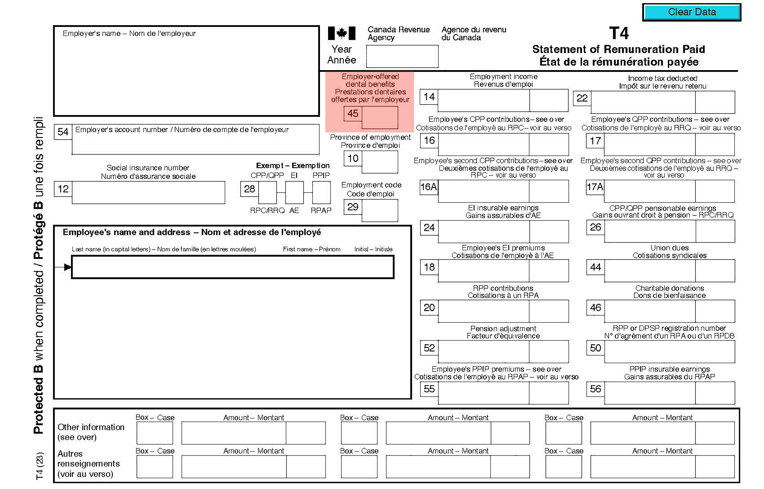 - Box 45, Employer-offered Dental Benefits, was added to the T4. This new box will be mandatory for all slips.
