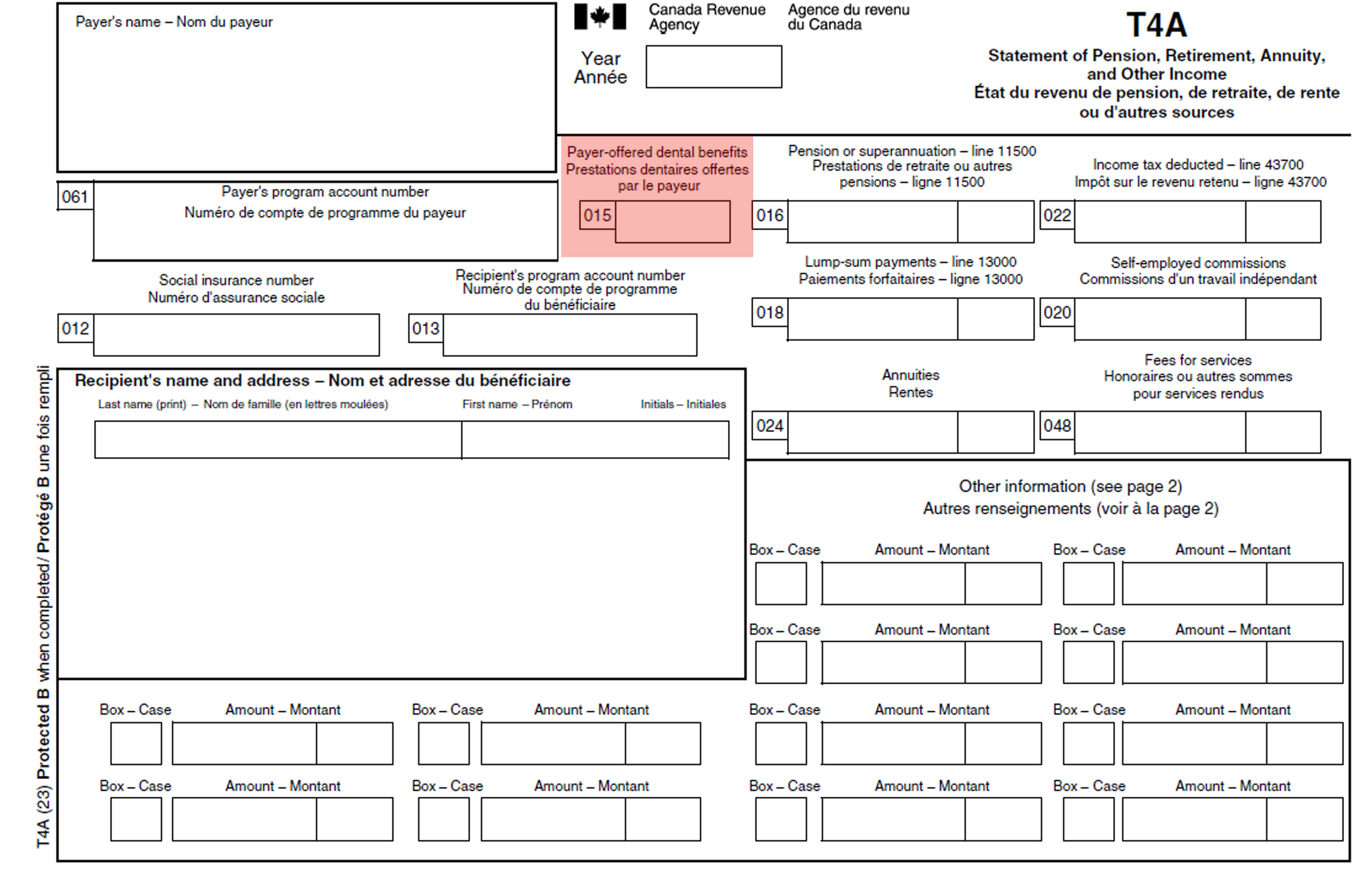 - Box 015, Payer-offered Dental Benefits, was added to the T4A. This new box will be mandatory if an amount is reported in Box 016, Pension or Superannuation. The box will otherwise be optional.